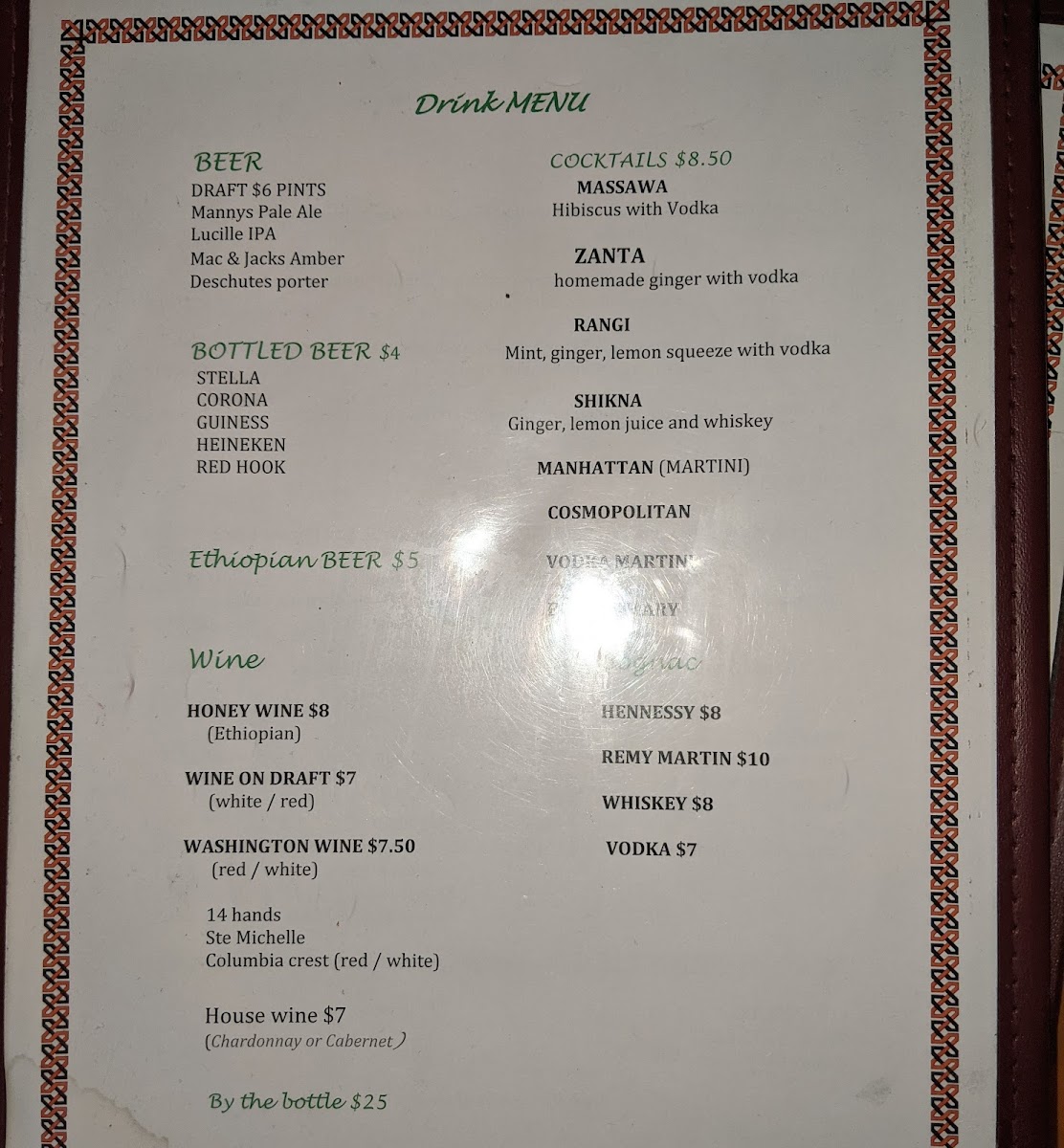 Drinks range from traditional brews and coffee to light refreshments—including mimosa and sangria—making the space inviting for anytime visits, whether for a laid-back brunch or an evening gathering. The presence of carefully roasted Ethiopian coffee and house-special lattes also reflects the restaurant’s connection to local and cultural traditions, enhancing the overall dining experience.