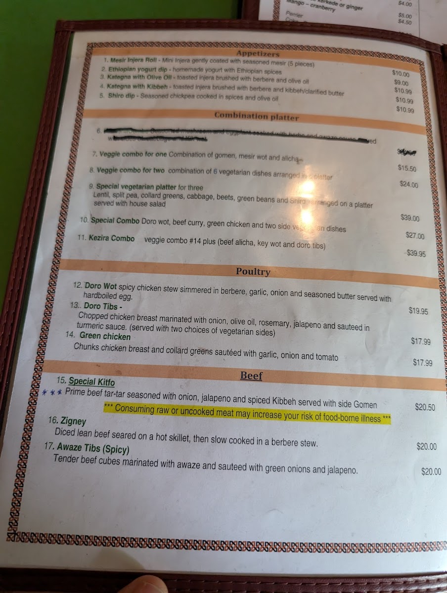 Guests often enjoy hearty options like the Doro Tibs or the Veggie Combo during lunch or dinner, pairing them with typical warm and spiced beverages such as Habesha Coffee Sini or a soothing cup of tea infused with cinnamon and cardamom. The menu also features unique dips served with injera, adding a casual, communal touch to the meal that complements the cozy atmosphere.